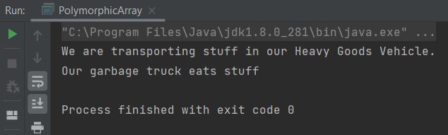 The above screenshot shows the output of running our PolymorphicArray class. The JVM uses virtual method invocation to dynamically invoke the correct subtype override. The
